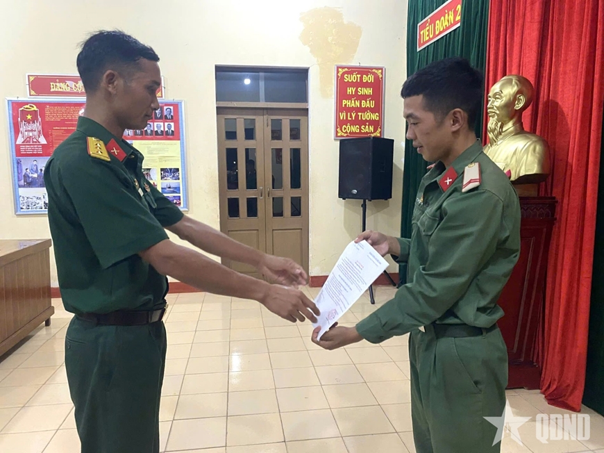 Bí thư Chi bộ trao quyết định kết nạp đảng viên cho Binh nhất Đặng Huỳnh Thiên Vỹ.