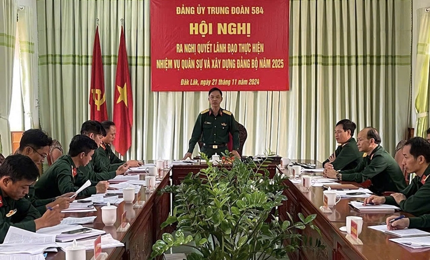 | Đảng ủy Trung đoàn 584 họp ra nghị quyết lãnh đạo năm 2025. |