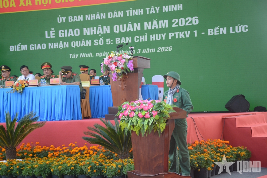 Đại diện các thanh niên nhập ngũ năm 2026 phát biểu tại lễ giao, nhận quân, Nguyễn Phúc Duy bày tỏ quyết tâm hoàn thành xuất sắc nhiệm vụ, phấn đấu xứng danh Bộ đội Cụ Hồ, xứng đáng với niềm tin của cấp ủy, chính quyền và nhân dân địa phương.
