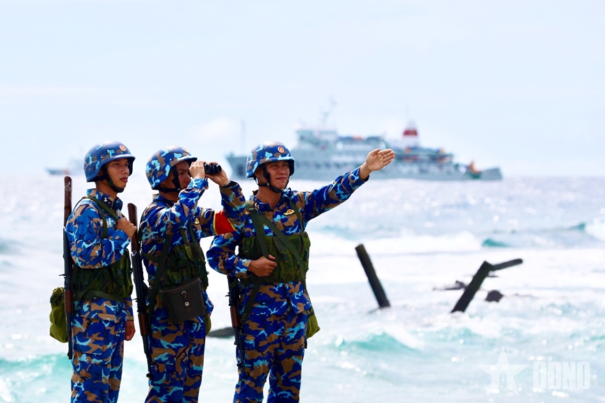 Cán bộ, chiến sĩ tuần tra trên đảo Song Tử Tây. |