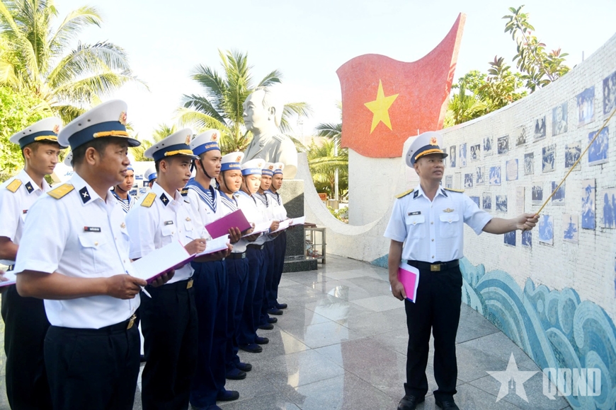Trung tá Từ Đức Thiện, Chính trị viên phó đảo Sơn Ca giáo dục truyền thống cho cán bộ, chiến sĩ đơn vị. |