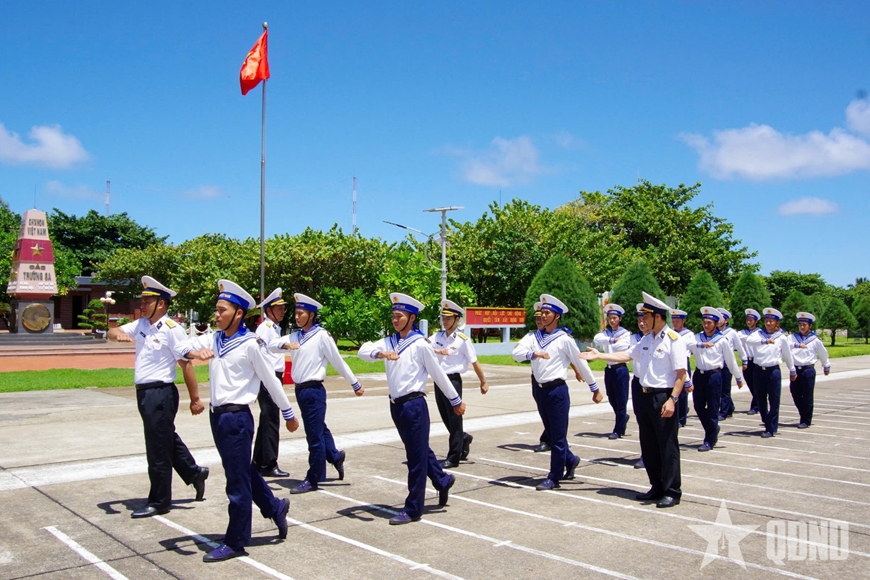 Cán bộ đảo Trường Sa hướng dẫn bộ đội luyện tập điều lệnh đội ngũ.