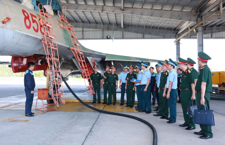 Đoàn công tác Cục Xăng dầu kiểm tra việc tra nạp nhiên liệu cho máy bay tại Trung đoàn 927, Sư đoàn 371, Quân chủng Phòng không-Không quân. Ảnh: LÊ NAM