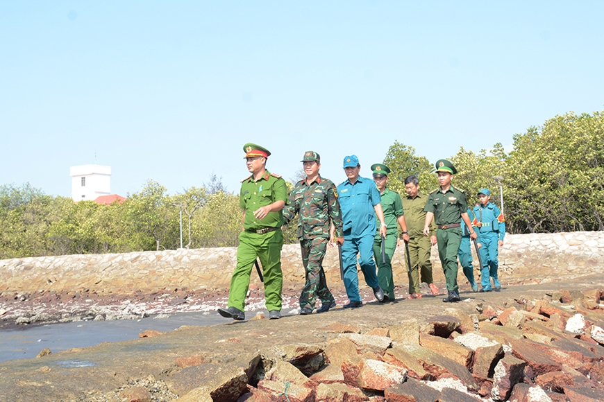 | Cán bộ, chiến sĩ xã đảo Thạnh An tuần tra vùng biên giới biển. |