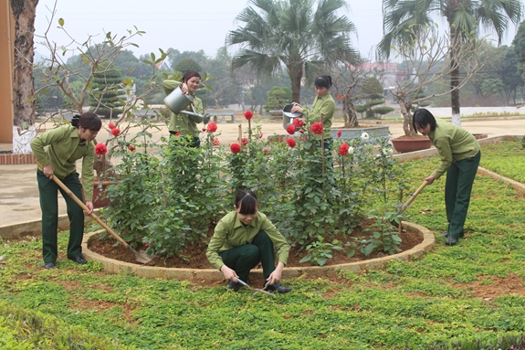 Hội viên Hội phụ nữ Trường Quân sự Quân đoàn 1 chăm sóc bồn hoa cây cảnh giờ thứ 8. |