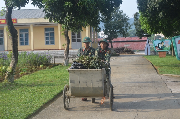 Đối với rác thải trong sinh hoạt hằng ngày của bộ đội, nhà trường đã kiên quyết phá bỏ các hố rác, các vị trí chôn lấp quanh doanh trại, tổ chức làm các xe thu gom rác thải cho các đầu mối cơ quan, khoa giáo viên và đơn vị và tiến hành hợp đồng với Công ty môi trường đô thị TP Tam Điệp để tiến hành thu gom, phân loại và tập kết chở đi, bảo đảm vệ sinh của địa bàn đóng quân. Đối với rác thải, chất thải trong chăn nuôi tập trung, nhà trường đã xây dựng hệ thống chuồng trại cơ bản, có bể chứa bằng công nghệ Biogas, vừa đảm bảo vệ sinh chuồng trại, không ảnh hưởng đến môi trường xung quanh vừa bảo đảm khí đốt phục vụ đời sống thiết yếu của bộ đội. Khu vực trồng rau xanh của các đơn vị đều áp dụng phương pháp trồng rau an toàn, đảm bảo rau xanh tươi tốt bốn mùa, cung cấp nguồn thực phẩm tại chỗ cho nhà trường, từng bước nâng cao đời sống bộ đội có đủ sức khỏe trong thực hiện nhiệm vụ huấn luyện, giáo dục đào tạo và sẵn sàng chiến đấu. Đại tá Lê Quang Ngọc cho biết thêm: “Để thực hiện tốt công tác tuyên truyền, cần phát huy hiệu quả vai trò nòng cốt, xung kích của tổ chức đoàn thanh niên”.