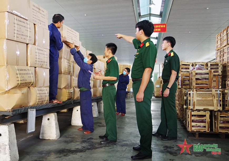 | Cán bộ Kho 690 kiểm tra đóng gói hàng hóa tại kho. |