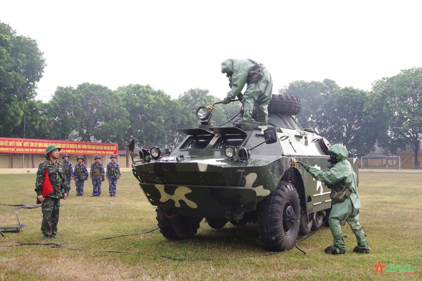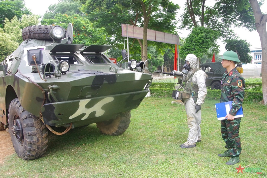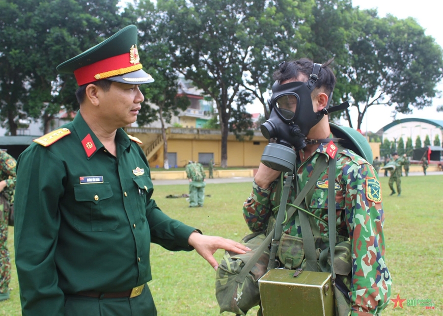 Đại tá Hoàng Văn Hoán, Phó hiệu trưởng Trường Sĩ quan Phòng hóa kiểm tra bộ đội động tác thực hành sử dụng khí tài đề phòng cá nhân.