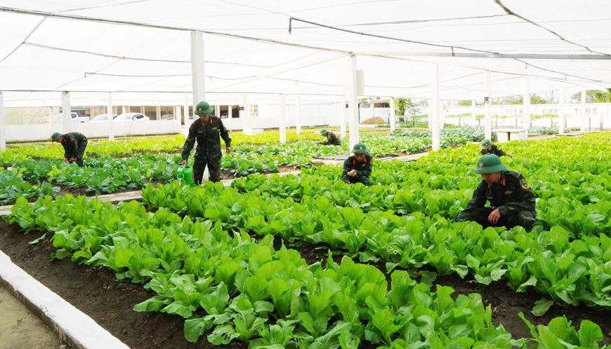 | Trung đoàn 841, Bộ chỉ huy Quân sự tỉnh Hà Tĩnh chăm sóc vườn rau chuẩn bị đón chiến sĩ mới. |
