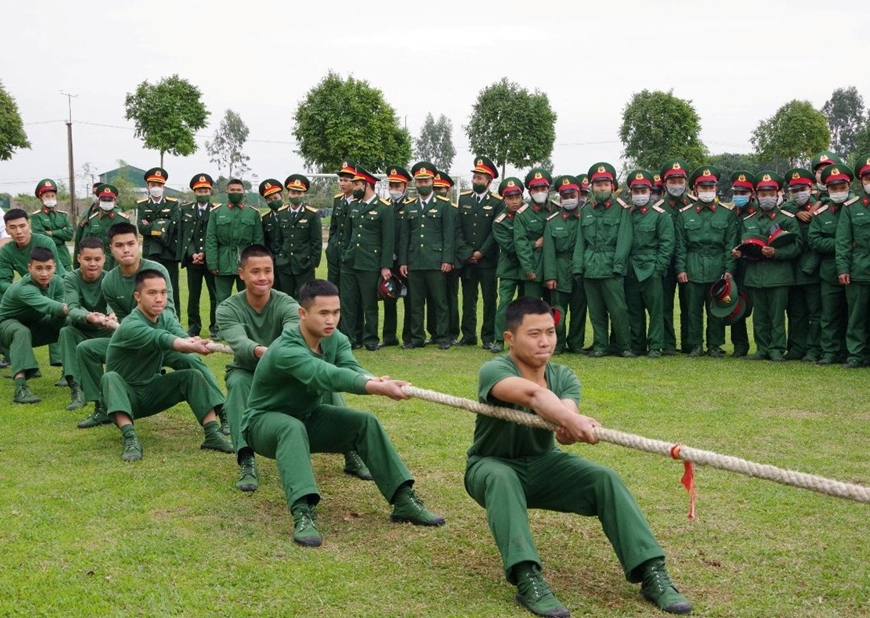 | Cán bộ, chiến sĩ Lữ đoàn 214 thi kéo co trong hoạt động vui xuân, đón Tết. |