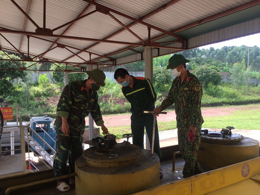 | Cán bộ, nhân viên Kho K10 thực hành tiếp nhận xăng dầu. Ảnh: NGUYỄN TUẤN |