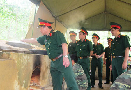 Thủ trưởng Bộ tư lệnh Công binh kiểm tra cơ sở vật chất của Lữ đoàn 249 phục vụ tập huấn cán bộ công binh toàn quân năm 2014. Ảnh: Vũ Xuân Dân.
