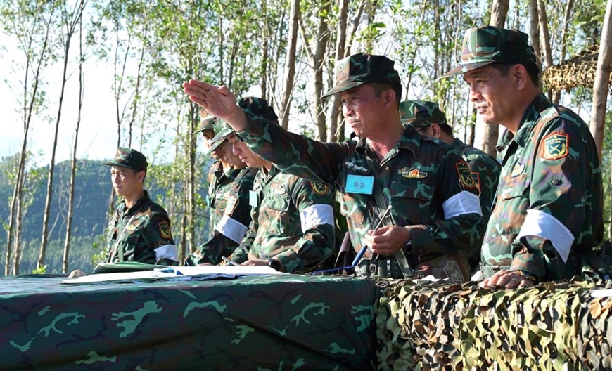 Chỉ huy Sư đoàn 2 bổ sung nhiệm vụ trinh sát thực địa tại điểm trinh sát chung trong diễn tập DT-25. Ảnh: VĂN HOÀNG