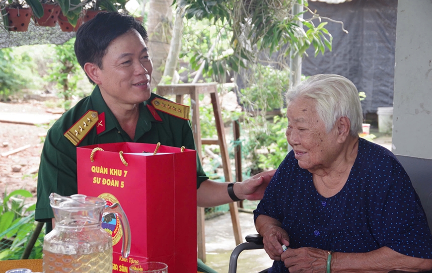 Lãnh đạo Sư đoàn 5 tặng quà đối tượng chính sách xã Đất Đỏ, TP Hồ Chí Minh trong chương trình về nguồn năm 2025. Ảnh: ĐIỀN HIỂN