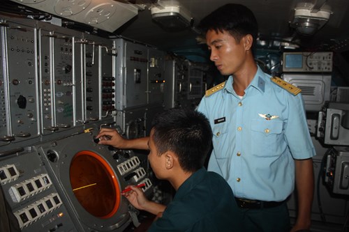 Thượng úy Phùng Khắc Tuyển hướng dẫn trắc thủ trên đài ra-đa.