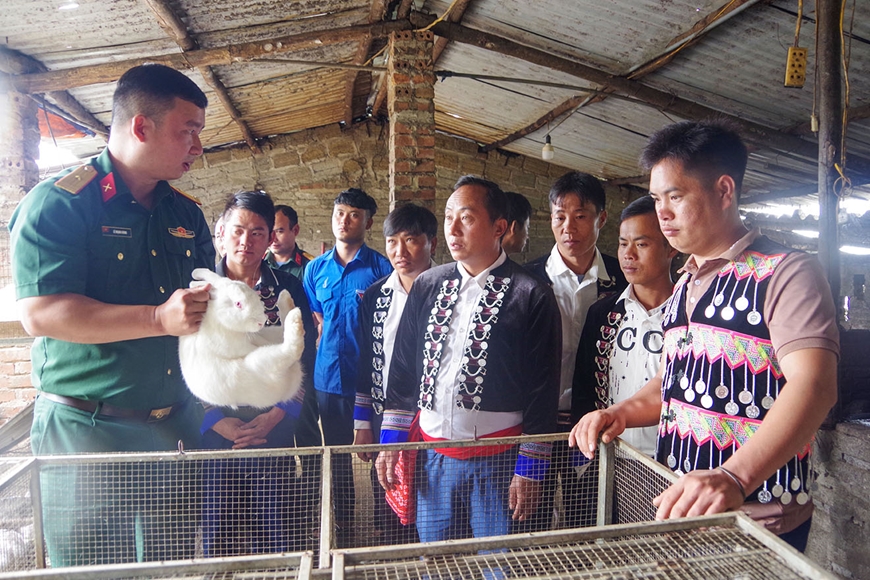 | Cán bộ Đội Sản xuất và Xây dựng cơ sở chính trị số 3, Đoàn Kinh tế-Quốc phòng 356 hướng dẫn người dân bản Sín Chải, xã Dào San, tỉnh Lai Châu kỹ thuật nuôi thỏ. |