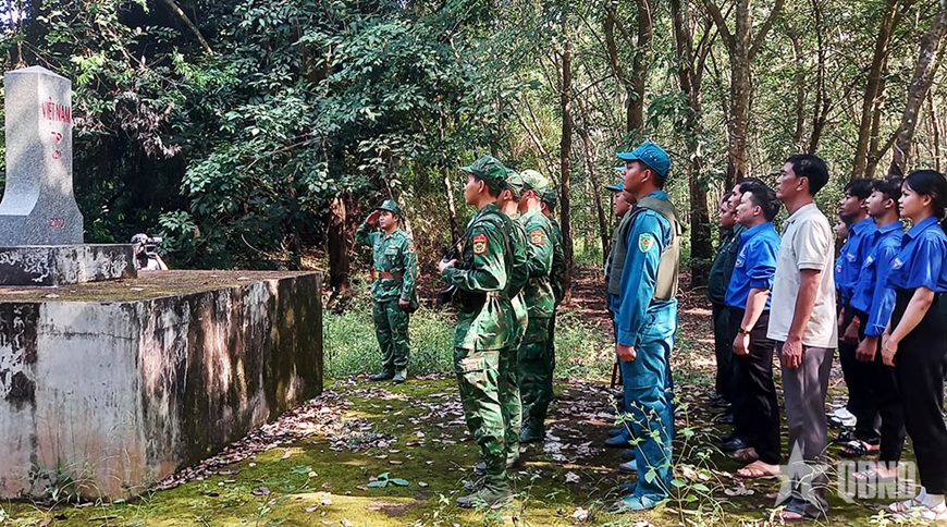 Sau quãng đường đi bộ, luồn rừng nhiều ki-lô-mét, tổ tuần tra đã đến được cột mốc chủ quyền 79 (2). Tại cột mốc thiêng liêng, các chiến sĩ trang nghiêm chào cờ, chỉnh trang, lau chùi bia mốc và dọn cỏ quanh chân cột mốc. Anh Dương Văn Nam, Bí thư Chi đoàn ấp Hưng Thịnh, xã Lộc Thịnh, chia sẻ: “Những ngày Tết Nguyên đán Bính Ngọ, ai cũng mong muốn ở bên gia đình, người thân quây quần đón xuân mới, nhưng các anh Bộ đội Biên phòng vẫn ngày đêm tuần tra, canh gác, giữ gìn an ninh trật tự vùng biên. Cho nên, chúng tôi cũng tình nguyện tham gia cùng các anh, góp chút công sức cho xuân mới thêm vui”.