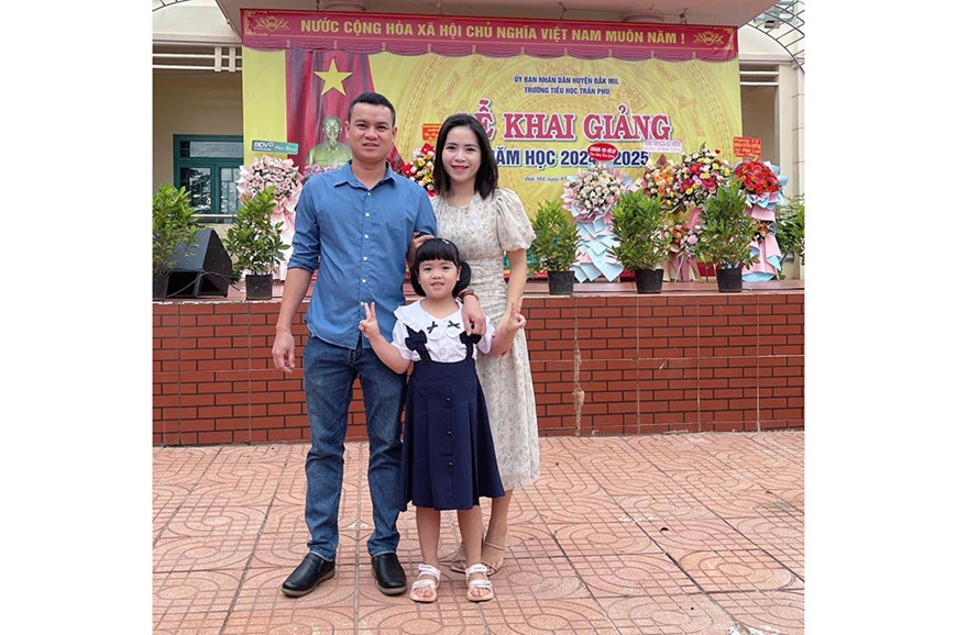 | Vợ chồng anh Nguyễn Tuấn Việt cùng con gái trong Lễ khai giảng năm học mới. Ảnh do nhân vật cung cấp |