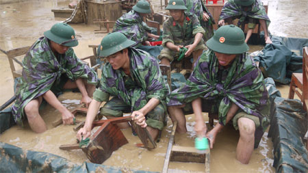 Giữa lúc chính quyền và nhân dân bề bộn khó khăn, bộ đội có mặt kịp thời tại các xã Nghĩa Phương, Nghĩa Mỹ (huyện Tư Nghĩa); thị trấn Chợ Chùa, các xã Hành Thiện, Hành Tín Đông, Hành Tín Tây (huyện Nghĩa Hành) để giúp các địa phương. Những ngày này, tại các trường mầm non, mẫu giáo, trường tiểu học, trạm y tế… đều bắt gặp hình ảnh bộ đội bất chấp trời mưa, dầm chân trong bùn non, nhiều nơi ngập ngang ống chân để dọn dẹp đổ nát, chùi rửa phòng ốc, bàn ghế… Cán bộ, chiến sĩ chạy đua với thời gian bằng không khí lao động khẩn trương từ sáng sớm, mỗi ngày làm việc hơn 8 giờ đồng hồ.