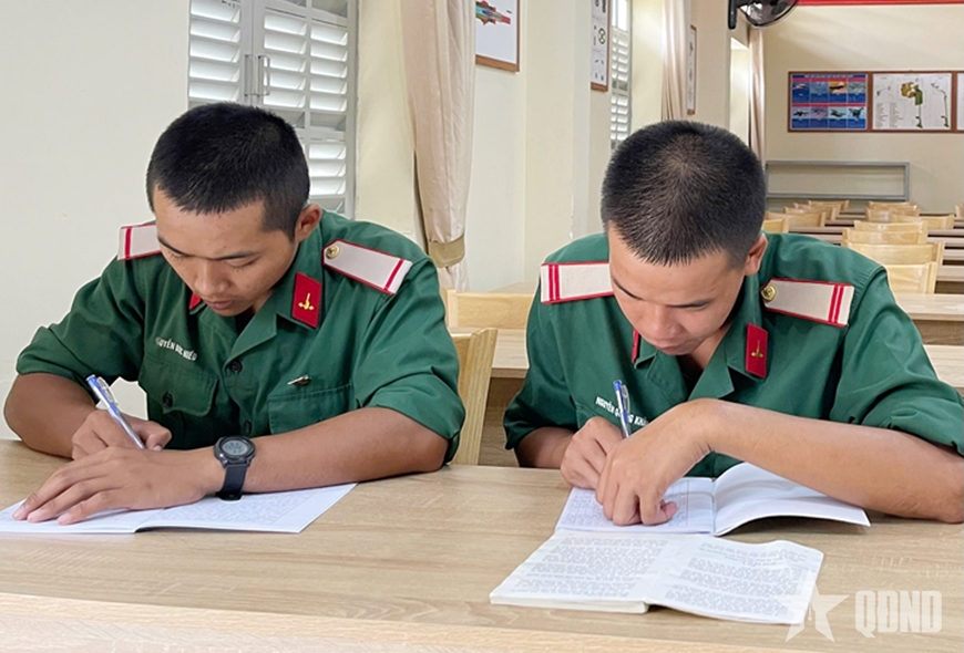 | Trung sĩ Nguyễn Quang Khải (bên phải) cùng đồng đội trong giờ tự học. |