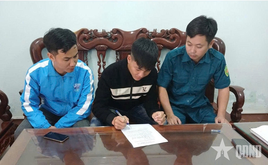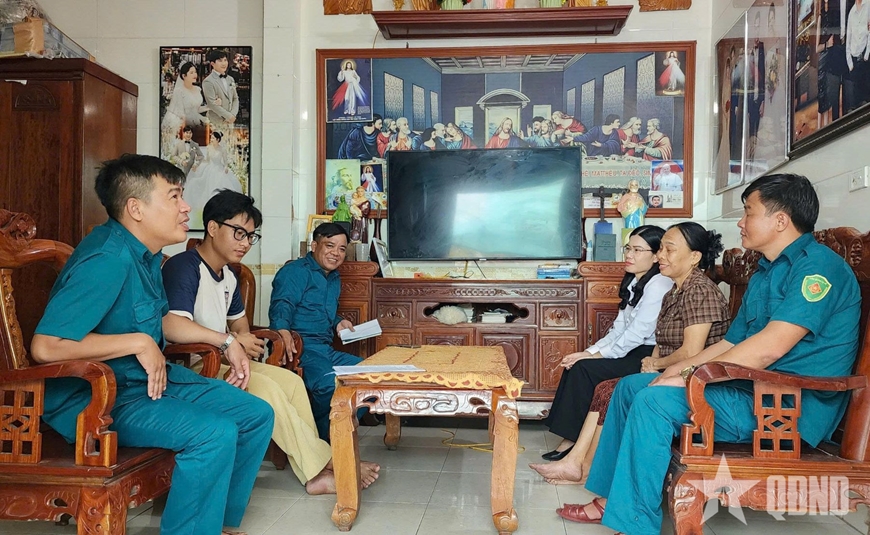 | Cán bộ, chiến sĩ dân quân Ban CHQS xã Lộc Hà (Hà Tĩnh) đến từng hộ gia đình làm nghề biển có thanh niên trong độ tuổi để tuyên truyền, nắm tình hình thanh niên chuẩn bị nhập ngũ. |