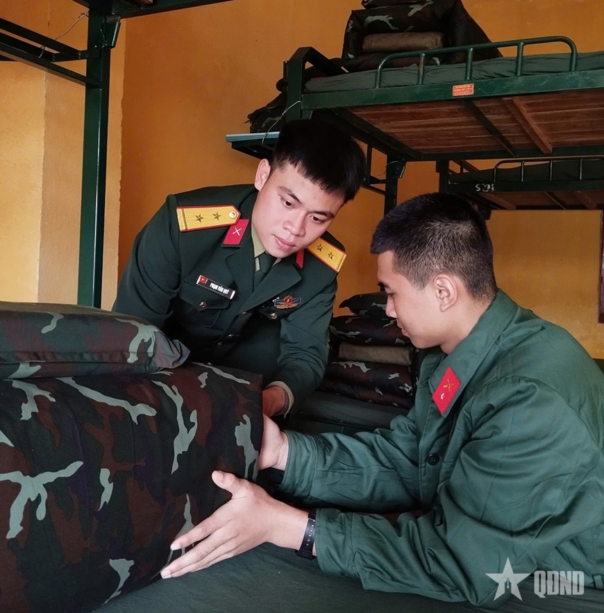 Chỉ huy Đại đội 4 hướng dẫn chiến sĩ Nguyễn Tiến Dũng gấp chăn màn. |