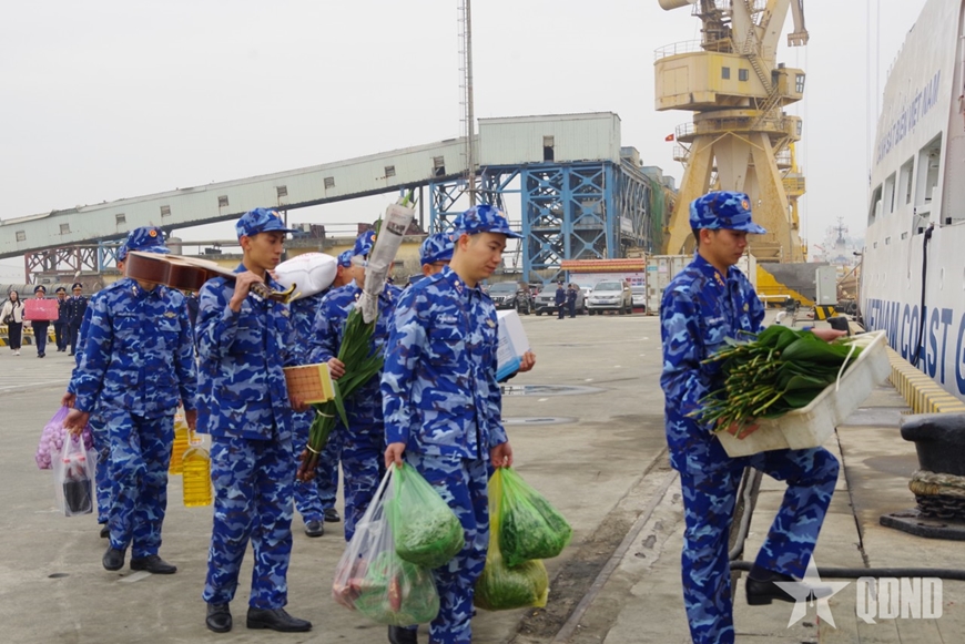 Thiếu tá QNCN Dương Đức Huấn, nhân viên điện tàu chia sẻ: “Đây là chuyến công tác đặc biệt của chúng tôi vì vừa phải làm nhiệm vụ trực sẵn sàng chiến đấu, tuần tra, kiểm tra, kiểm soát đấu tranh phòng chống buôn lậu, gian lận thương mại, phòng, chống khai thác hải sản bất hợp pháp, không báo cáo và không theo quy định (IUU), vừa đón Tết Nguyên đán Bính Ngọ 2026 trên biển. Ngoài chuẩn bị lương thực, thực phẩm theo tiêu chuẩn hằng ngày, tàu còn chuẩn bị thêm gạo nếp, lá dong, bánh kẹo, dưa hành và cây đào, cây quất, báo tường trang trí phòng đón xuân để anh em đón Tết trên biển được ấm cúm, vơi đi nỗi nhớ nhà. Mặc dù khối lượng hàng khá nhiều nhưng toàn tàu tổ chức vận chuyển rất nhanh gọn, chỉ hơn một giờ là xong tất cả”.