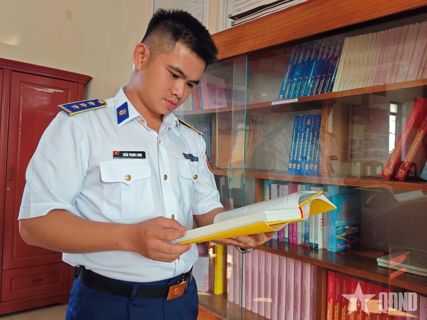 | Thượng úy Trần Thanh Long nghiên cứu tài liệu để bổ sung, hoàn chỉnh đề cương. |