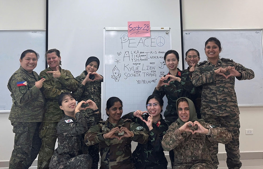 | Đại úy Nguyễn Thị Minh Trang (đứng thứ ba, từ phải sang) tham gia khóa huấn luyện về gìn giữ hòa bình Liên hợp quốc, năm 2025. Ảnh do nhân vật cung cấp |