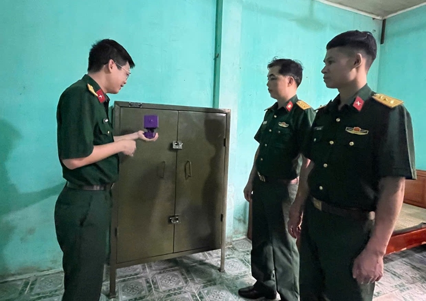 | Trung tá Nguyễn Trần Tiến hướng dẫn sử dụng thiết bị “Hệ thống an ninh kho vũ khí”. |