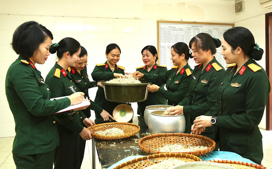 Thấy chúng tôi chăm chú nhìn món giá đỗ xào thịt lợn vừa chín tới, đang bốc hơi nóng hổi, Thiếu tá QNCN Nguyễn Thị Tuyết Nhung, nhân viên Phòng Hậu cần-Kỹ thuật kiêm Chủ tịch Hội Phụ nữ Phòng Hậu cần-Kỹ thuật, Sư đoàn 301, không giấu được tự hào, khoe khéo: "Giá đỗ của Hội Phụ nữ Phòng Hậu cần-Kỹ thuật, Sư đoàn 301 trực tiếp làm theo mô hình “Giá đỗ đồng đội”, mới nhập bếp hôm nay đấy ạ. Thịt lợn do đơn vị tăng gia. Các món ăn vừa bảo đảm an toàn vệ sinh thực phẩm tuyệt đối, vừa góp phần bảo đảm chất lượng cho bữa ăn bộ đội ở đơn vị...".