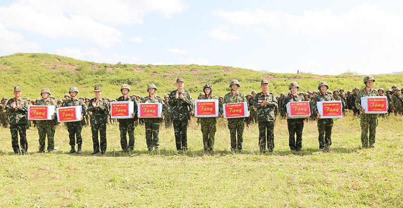 | Thủ trưởng Bộ tư lệnh Quân khu 1 trao quà tặng đơn vị đạt thành tích cao trong diễn tập. |