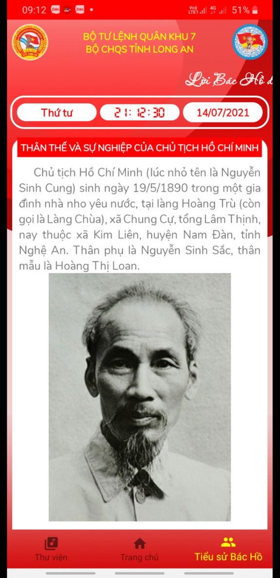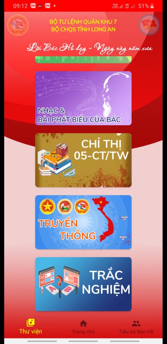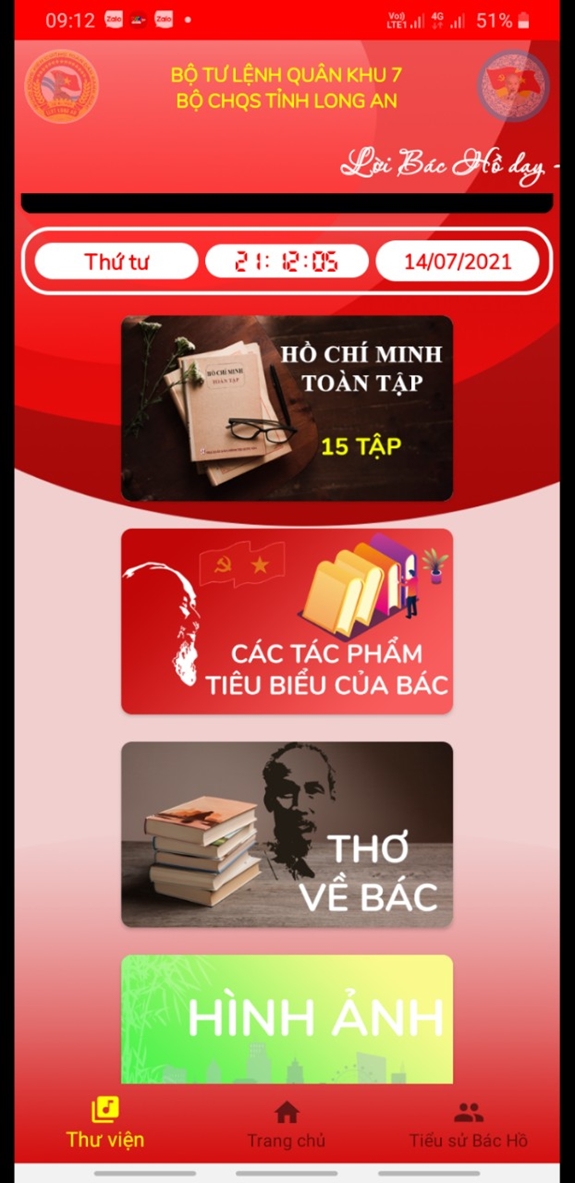 Thư viện trong ứng dụng là bộ sưu tập cung cấp nhiều thông tin, dữ liệu quan trọng về thân thế, sự nghiệp của Bác Hồ (tiểu sử của Bác, Hồ Chí Minh toàn tập, tác phẩm tiêu biểu của Bác, thơ về Bác, hình ảnh về Bác, nhạc về Bác, bài phát biểu của Bác, Chỉ thị số 05, trắc nghiệm tìm hiểu về Bác, truyền thống Quân đội...) mà người dùng có thể nghiên cứu, tham khảo, tải nội dung. Đặc biệt phần trắc nghiệm tìm hiểu về Bác được xây dựng kết cấu hết sức sinh động tạo cho người chơi những giây phút thoải mái mà vẫn có thể học tập, tìm hiểu về Bác; bộ đội hết sức phấn khởi khi tham gia trò chơi trong ứng dụng sau mỗi giờ huấn luyện vất vả trên thao trường.