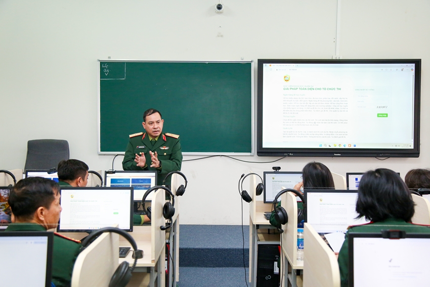 | Thiếu tướng, TS Nguyễn Đình Trung, Bí thư Đảng ủy, Chính ủy Học viện Khoa học Quân sự chỉ đạo công tác tập huấn chuyển đổi số trong kiểm tra, đánh giá năng lực ngoại ngữ của Học viện. Ảnh: NGÔ QUÝ CHUNG |