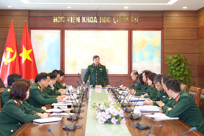 | Thiếu tướng, PGS, TS Trần Ngọc Trung, Giám đốc Học viện Khoa học Quân sự chủ trì hội nghị triển khai nhiệm vụ biên soạn giáo trình tiếng Anh chuyên ngành quân sự. Ảnh: NGÔ QUÝ CHUNG |