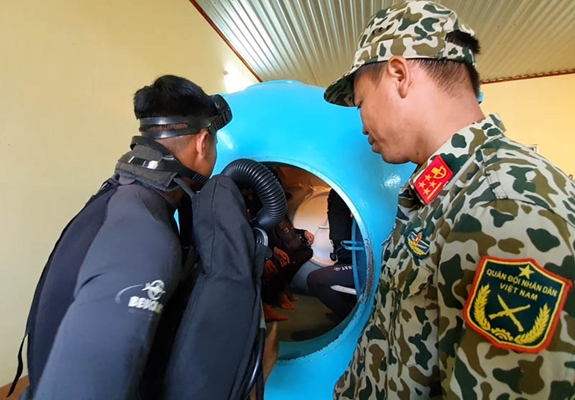 | Rèn luyện sức chịu đựng áp lực độ sâu nước biển trong buồng tăng, giảm áp. |