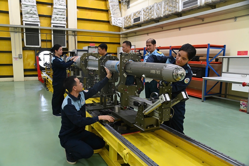 | Kỹ sư, công nhân Nhà máy A31 bảo dưỡng đạn tên lửa. Ảnh: ÁNH TUYẾT |
