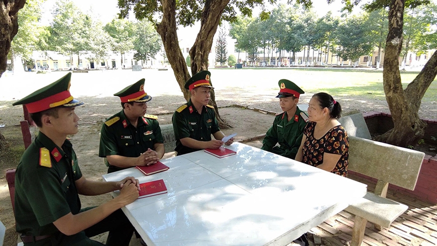 | Cán bộ Tiểu đoàn 2, Lữ đoàn Thông tin 29, Quân khu 9 trò chuyện với gia đình khi lên thăm chiến sĩ mới. |