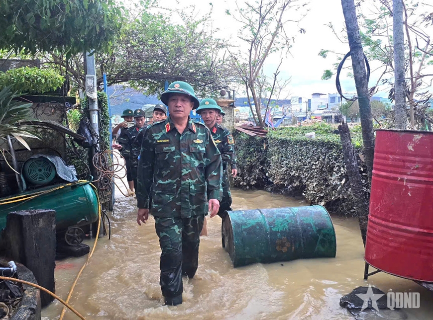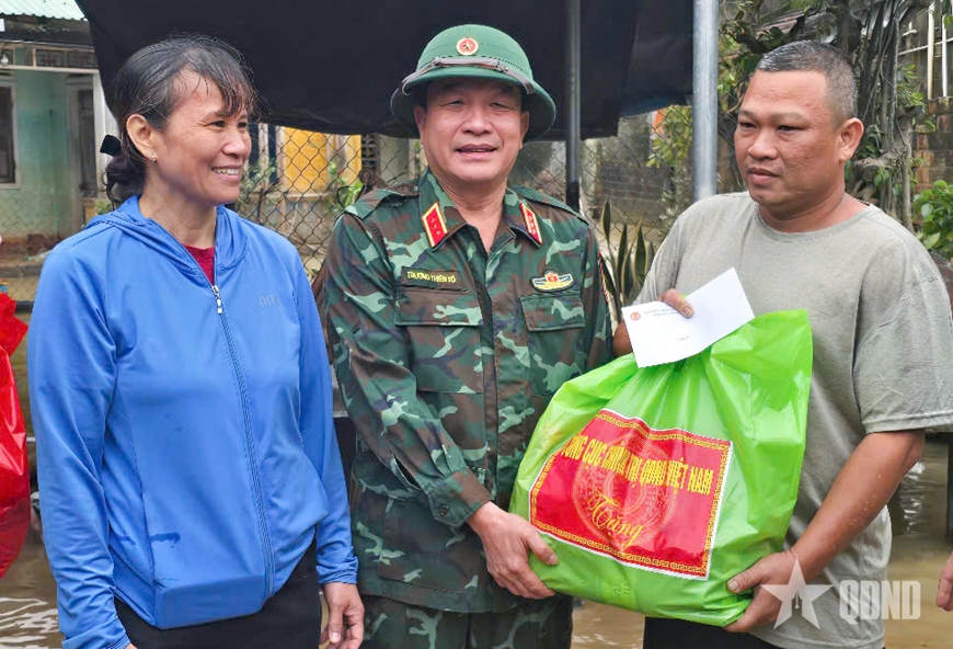 | Thượng tướng Trương Thiên Tô thăm người dân bị ngập ở khu phố 6, phường Quy Nhơn Đông, tỉnh Gia Lai. |