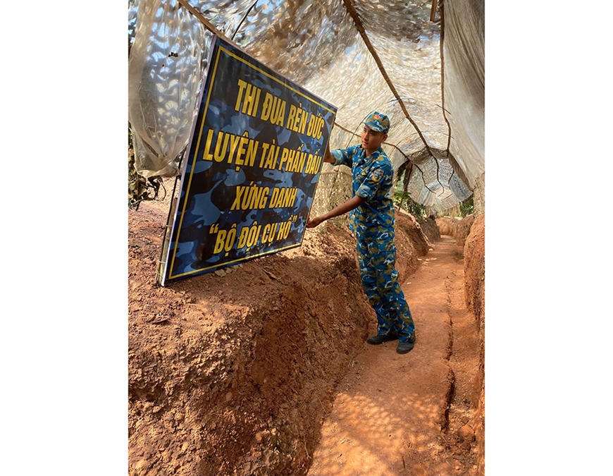 | Binh nhất Mai Xuân Khải tham gia làm công tác cổ động thao trường trong đợt diễn tập có bắn đạn thật tại Trường bắn Quốc gia khu vực 1. |