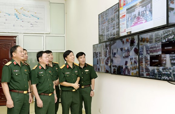 Thiếu tướng Hà Tuấn Vũ và Thiếu tướng Phạm Đức Dũng- Giám đốc HVHC (hàng đầu, thứ nhất và thứ 2 từ trái qua) kiểm tra hoạt động tại Trung tâm điều hành huấn luyện của học viện. |