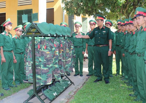 Thiếu tá Vũ Dũng hướng dẫn chiến sĩ sử dụng “Giá phơi đa năng”.