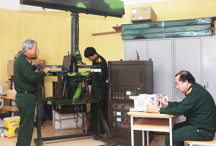 | Cán bộ, giảng viên Khoa Vô tuyến điện tử kiểm tra hiệu quả các sáng kiến, cải tiến kỹ thuật phục vụ nhiệm vụ đào tạo. |