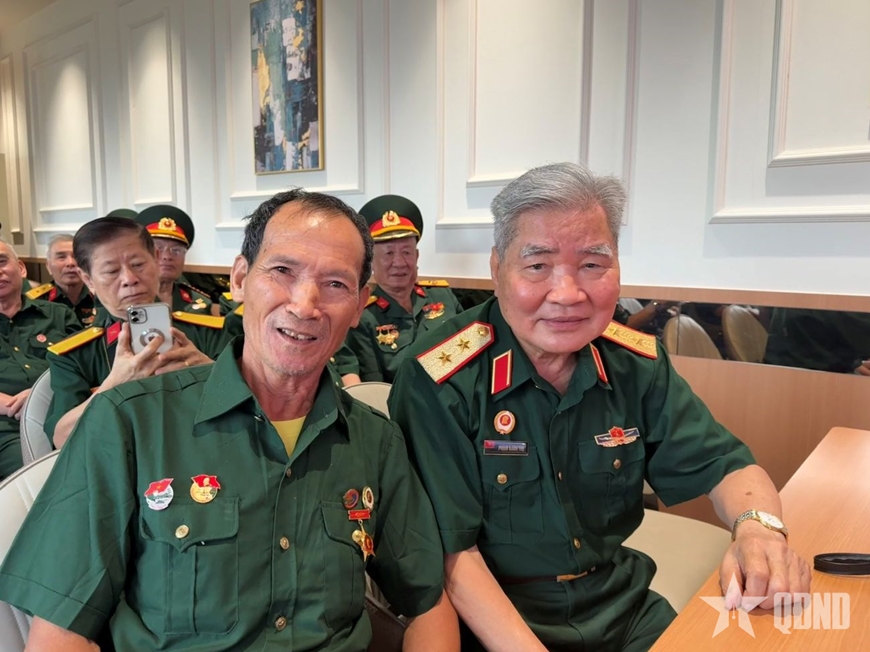 | Trung tướng Phạm Xuân Thệ (bên phải) cùng chiến sĩ năm xưa của mình. |