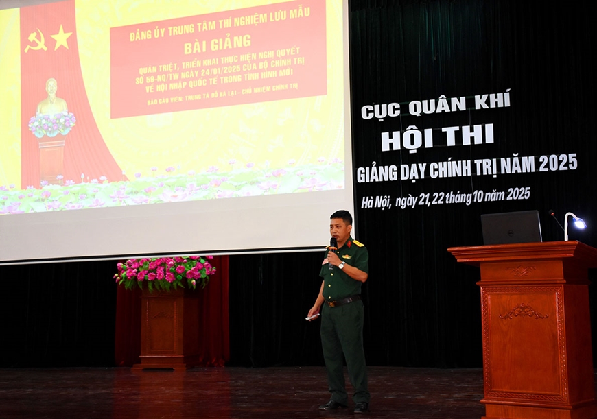 Trong phần thi thực hành, Trung tá Đỗ Bá Lại, Chủ nhiệm Chính trị Trung tâm Thí nghiệm lưu mẫu (Cục Quân khí) thực hành giảng chuyên đề “Quán triệt, triển khai thực hiện Nghị quyết số 59-NQ/TW ngày 24-1-2025 của Bộ Chính trị về hội nhập quốc tế trong tình hình mới”. Cùng với phân tích nội dung, thí sinh đưa nhiều thông tin mới trong thực hiện triển khai nghị quyết, vận dụng với công tác đối ngoại quốc phòng của Đảng và Nhà nước.