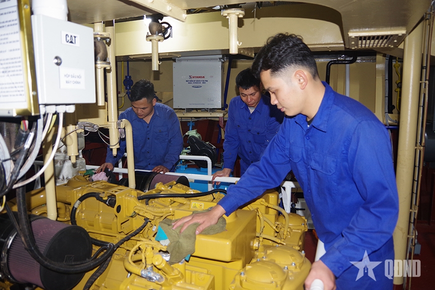 | Cán bộ, thuyền viên Tàu 14-11-89 bảo quản, bảo dưỡng máy tàu. |
