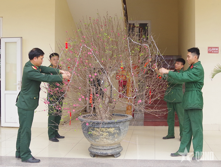 Cán bộ, chiến sĩ Tiểu đoàn Vận tải thủy 4 (Lữ đoàn Vận tải 653) trang trí, chuẩn bị đón Tết tại khu vực đóng quân trên đất liền.