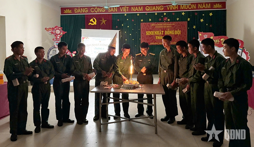 Buổi tối, trong không khí ấm áp, gần gũi như những gia đình, cán bộ, chiến sĩ Tiểu đoàn 162 lại quây quần tổ chức sinh nhật đồng đội. Cán bộ, chiến sĩ cùng trang trí, chuẩn bị tổ chức sinh nhật, cùng thổi nến, cắt bánh, vai kề vai cất cao lời ca, tiếng hát. Tình đồng chí, đồng đội thân thiết, chân tình khiến mỗi chiến sĩ vơi đi nỗi nhớ nhà, nhớ người thân, giúp họ thêm yêu đơn vị, đoàn kết bên nhau hoàn thành tốt nhiệm vụ.