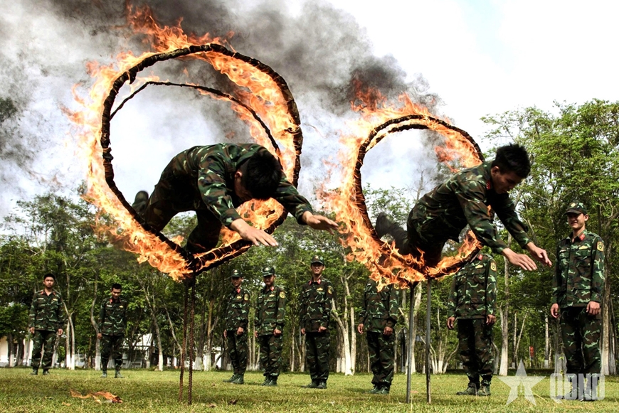 Sau bài võ thuật, các chiến sĩ bước vào nội dung được xem là “thử thách bản lĩnh” như leo tường, vượt vòng lửa. Vòng lửa được đốt lên đỏ rực, táp nóng mặt. Mỗi chiến sĩ, theo thứ tự, chạy lấy đà, bám tường, kéo người vượt lên, rồi lao qua vòng lửa đang cháy trong tiếng hô khẩu lệnh. Từng động tác phải gọn, nhanh và chuẩn xác để mô phỏng sát nhất môi trường chiến đấu thật.