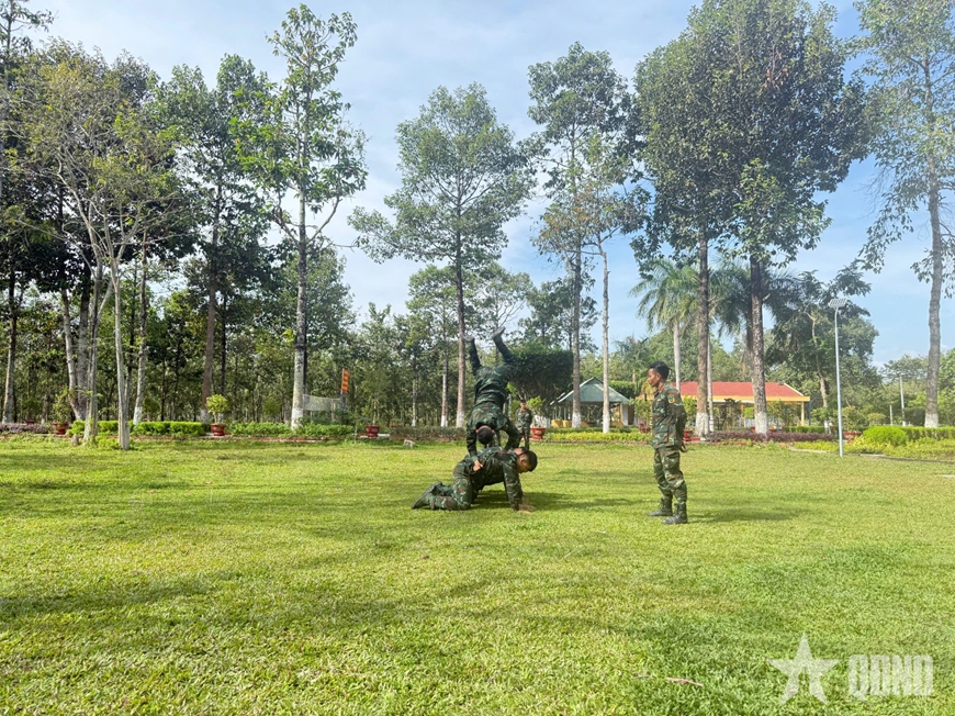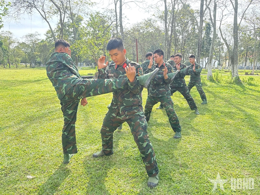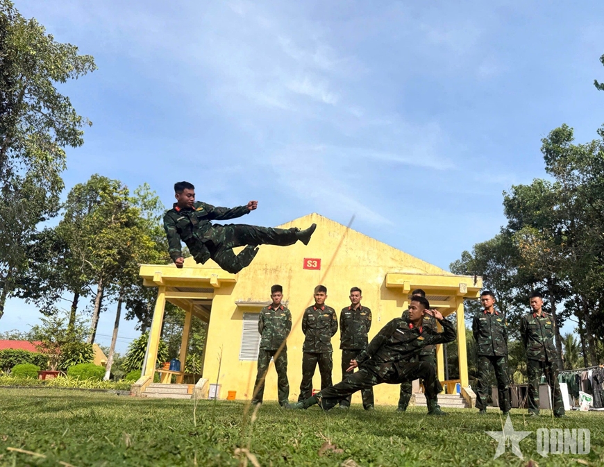 Vào một buổi sáng những ngày cuối năm 2025, sân cỏ thao trường còn đẫm sương nhưng hàng chục chiến sĩ đã sẵn sàng bước vào bài võ thuật mở đầu ngày huấn luyện “35 thế liên quyền”. Từng cú đấm, cú đá dứt khoát, từng bước di chuyển mạnh mẽ, chính xác; tiếng hô dậy vang cả góc thao trường. Mồ hôi túa ra trên từng gương mặt trẻ, nhưng ánh mắt ai nấy đều tập trung, kiên định.